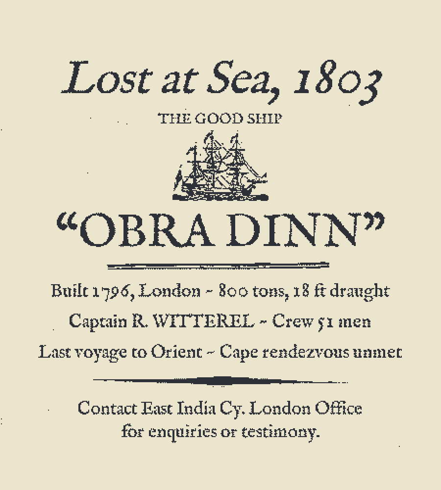 Return of the Obra Dinn is a detective game developed by Lucas Pope and released in 2018. In it, you take on the role of an insurance adjuster who is tasked with investigating the ghost ship Obra Dinn after she drifts to port four years after being declared lost at sea in 1803 (it now being 1807). Why are you an insurance adjuster? Because that ship was under the employ of the Honourable East India Company, and it wants to get a payout. If any of its employees committed crimes, such as mutiny or murder, during the voyage, then it needs to know so it can deal with their estates accordingly. However, there is not much in the way of evidence on board. Only a few corpses are to be found, and there is no written record to flip through. Instead, the inspector must make use of a mysterious pocket watch, known as the Memento Mortem, on the corpses to travel back in time to the exact moment that they died. While visiting these “memories", they can find other corpses that were disposed of later, bringing their “ghosts" back onto the ship to use the Memento Mortem on. By finding every memory and carefully examining all of the clues therein, be they obvious or subtle, the inspector can fill their book with the fates of all sixty people onboard. All except two, that is. If they get every other fate correct, they can be sent the materials needed to solve the last two in the so-called Bargain chapter and finally bring the mystery to a close.